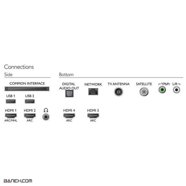 به لطف تکنولوژی وای داخلی (Wi-Fi 11n) شما می توانید بدون نیاز به کابل، به اینترنت متصل شوید تا از ویژگی های آنلاین بهرمند شوید. البته اتصال به اینترنت از طریق پورت LAN نیز امکان پذیر خواهد بود. فیلیپس بر روی تلویزیون 55PUS6412 یک سری کامل از ورودی و خروجی ها را قرار داده تا بتوانید هر دستگاهی را از دی وی دی پلیر و کنسول بازی گرفته تا فلش USB را به تلویزیون متصل کنید. این پورتها شامل 4 عدد HDMI، دو عدد USB، پورت LAN، خروجی هدفون، خروجی صوتی دیجیتال و آنتن می باشند. با استفاده از پورتهای HDMI می توانید صدا و تصویر را با کیفیت بالا منتقل کنید. به سادگی می توانید هارد دیسک و یا فلش USB خود را به تلویزیون با استفاده از پورت USB متصل کنید تا از مشاهده عکس ها، گوش دادن به موسیقی و یا تماشای فیلم های مورد علاقه خود بر روی صفحه بزرگ تلویزیون فیلیپس لذت ببرید. فیلیپس این تلویزیون هوشمندش را به تیونرهای داخلی DVB T/C/T2/T2-HD/S/S2 مجهز کرده. با وجود این تیونرهای داخلی دیگر نیازی به خرید دستگاهی جداگانه برای پخش شبکه های دیجیتالی ندارید و می توانید تنها با استفاده از یک آنتن کوچک، از مشاهدهی این شبکه ها با کیفیت بالا لذت ببرید.