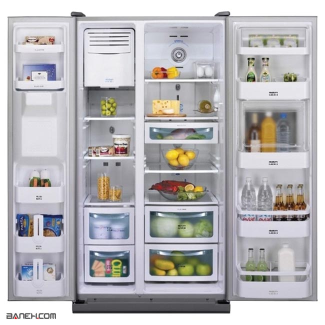 با باز کردن این دو درب، با فضایی بزرگ و جادار جهت نگه داری مواد غذایی مواجه می شویم. محفظه ی یخچال دارای چهار طبقه شیشه ای و 3 کشو می باشد. از ویژگی های این قفسه ها می توان به قابلیت تنظیم آن ها اشاره کرد که قرار گیری ظروف با ارتفاع زیاد را نیز امکان پذیر می سازد. روی درب هم 3 طبقه جهت نگه دارای بطری ها و یک طبقه هم جهت نگه داری مواد لبنی قرار داده شده. قسمت فریزر هم شامل سه طبقه و 2 کشو می باشد. روی درب هم 4 محفظه جهت فریزر کردن مواد غذایی کوچک تر قرار داده شده.