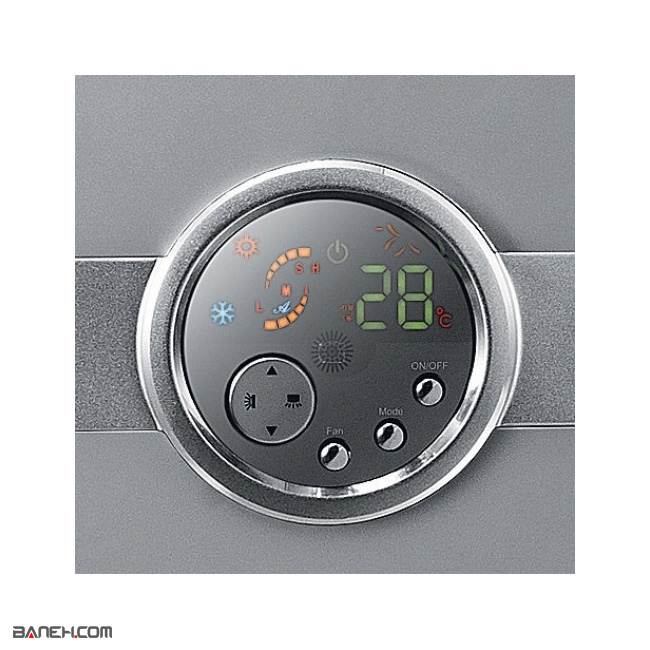 در زیر این دریچه خروجی هوا کنترل پنل قرار داده شده است که شامل نمایشگر به همراه یک سری از دکمه ها برای تنظیمات کولر گازی می باشد. می توانید تنظیمات اعمال شده بر روی دستگاه را بر روی نمایشگر با استفاده از چراغ های موجود بر روی آن مشاهده کنید. بعد از فعال کردن هر تابع در این کولر گازی چراغ مربوط به آن روشن خواهد شد که شما را از فعال بودن آن ها مطلع می سازد. همچنین این کولر گازی به همراه یک ریموت کنترل هوشمند ارائه می شود که شما می توانید جهت سهولت استفاده از این ریموت کنترل برای تنظیمات مربوط به دستگاه استفاده کنید. شما به راحتی با استفاده از این ریموت کنترل می توانید توابع مختلف را از راه دور فعال کنید و یا سرعت فن و حالت های مختلف کولر را تغییر دهید.